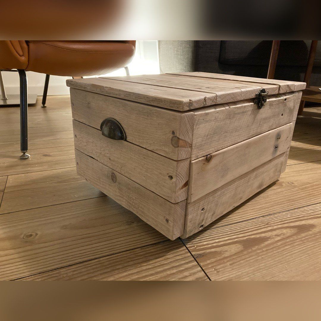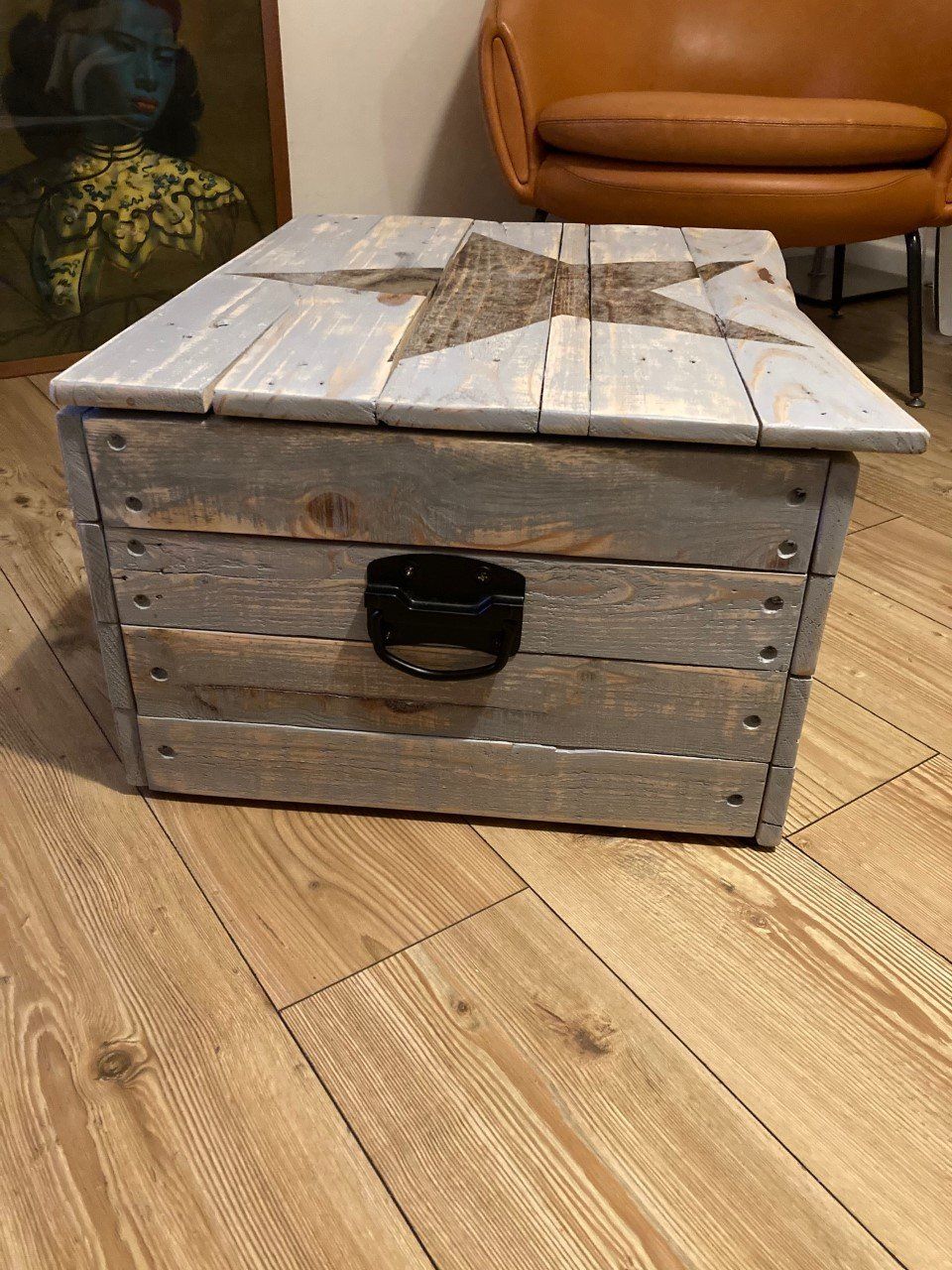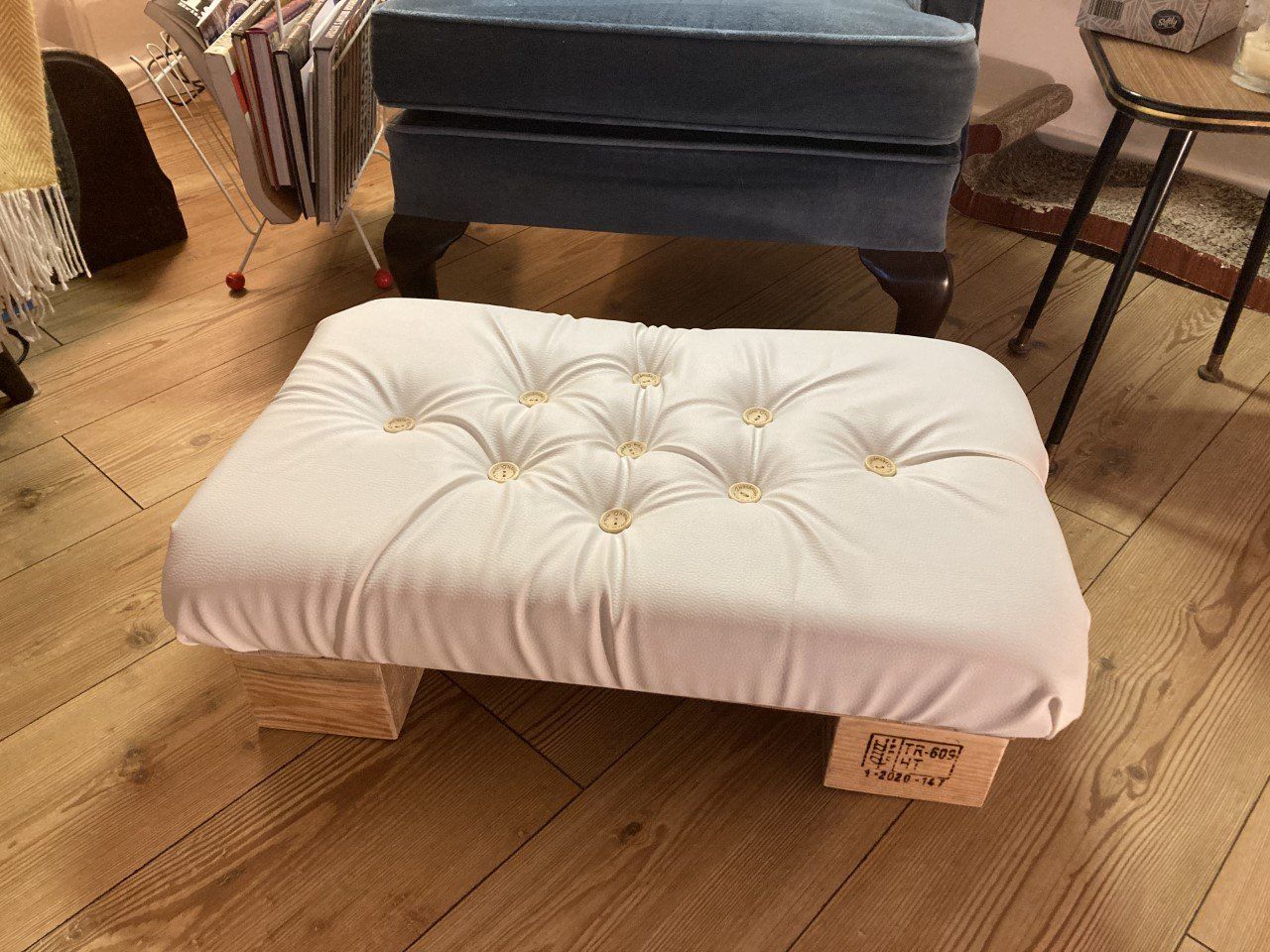 Made from Reclaimed Wood, upholstered with a faux leather and finished with wooden buttons